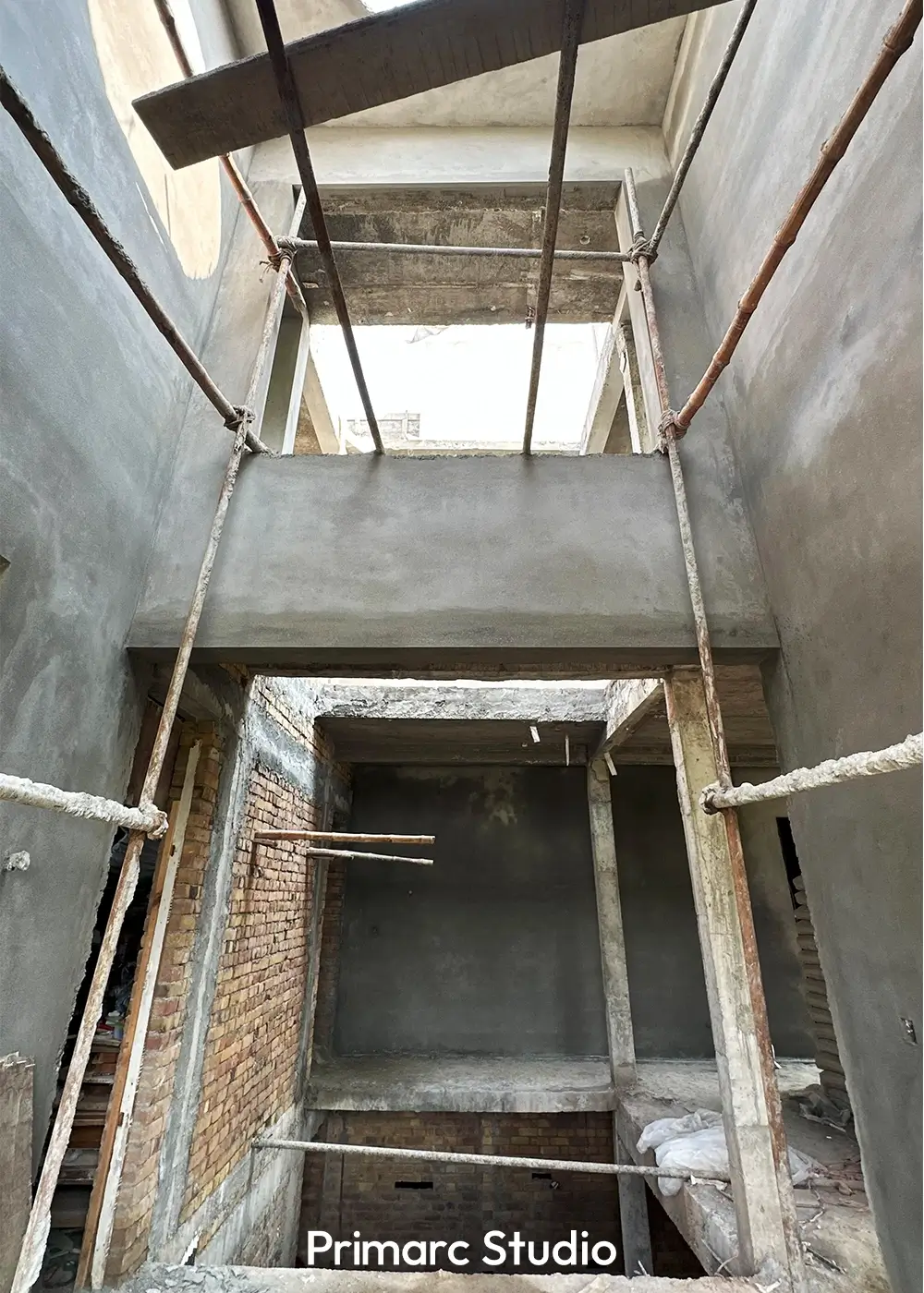 Interior spaces, including the atrium and circulation areas, are under active development, while exterior finishes are progressing with scaffolding and plaster work.