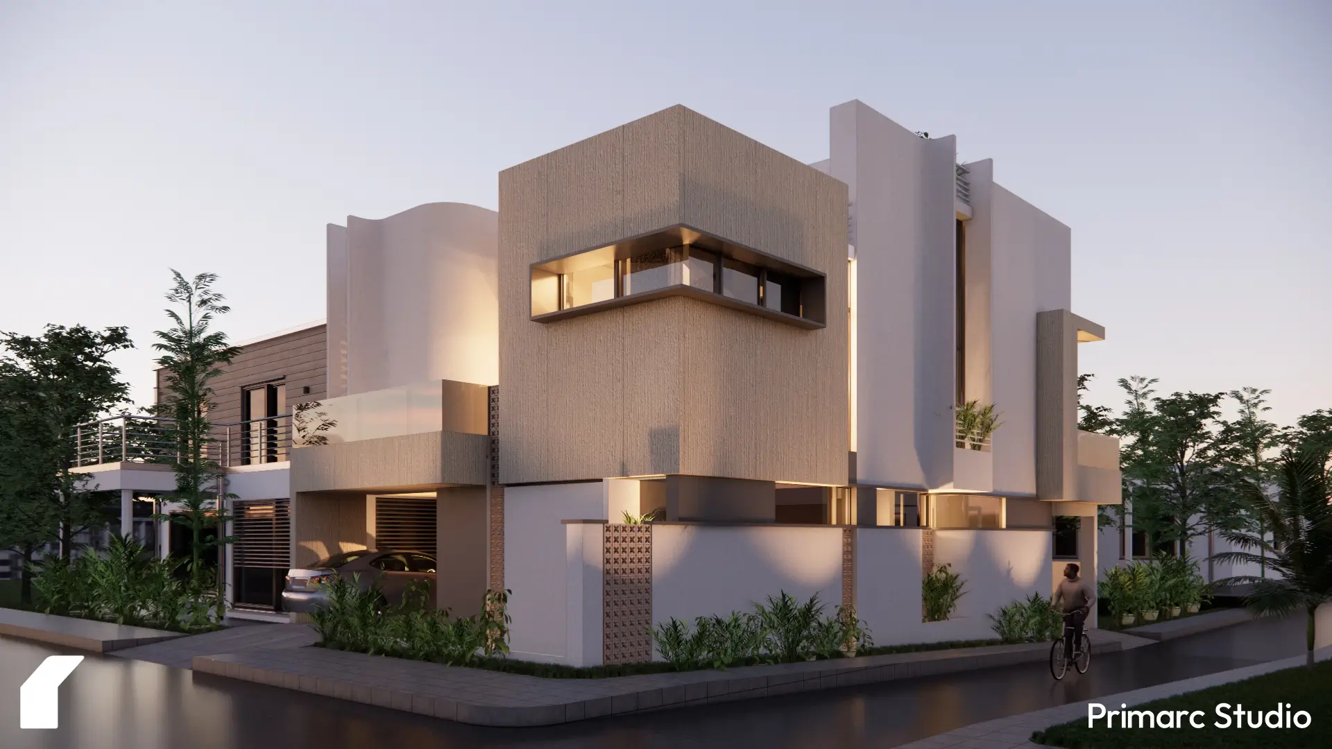 The materials selected are critical to the design, used to differentiate forms and add textural richness. The primary finish is a smooth white plaster, which provides a clean, bright, and modern canvas for the main structural walls and the signature curved element. This is deliberately contrasted by a vertically-grooved, sand-colored texture applied to the main cantilevered box. This coarse finish lends that volume a sense of earthy solidity, creating a dramatic focal point.