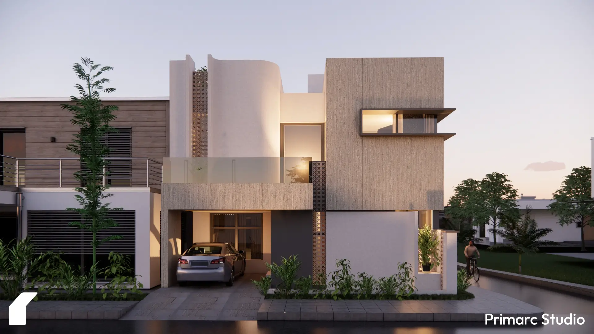 To further enrich the facade, strips of patterned concrete breeze blocks (jali) are integrated as a modern interpretation of a traditional screening element. This element provides privacy and natural ventilation while casting intricate patterns of light and shadow throughout the day. The final palette is completed by large glass panels and balcony railings framed in slim, dark metal, which ensure ample natural light and add a sharp, graphic quality to the design, all while maintaining a sleek, modern aesthetic.