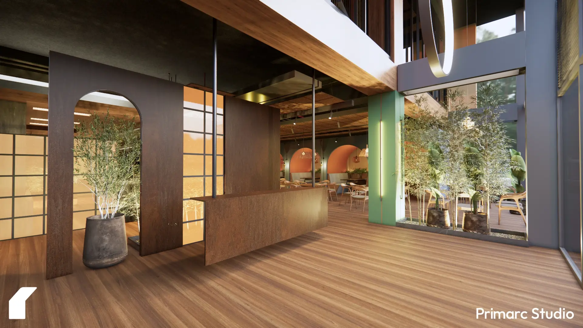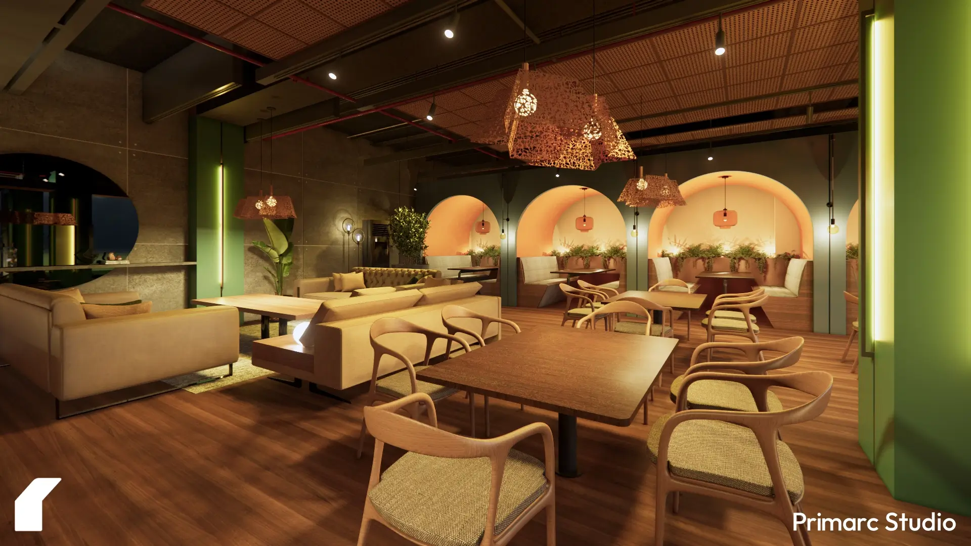 The design draws from natural textures, soft lighting, and a palette of earthy tones, creating a sense of calm that balances the energy of a lively restaurant. Each zone within the restaurant is defined subtly: the main dining area with its rhythmic arches and warm lighting; the casual seating that blends openness with intimacy; and a private dining space on the upper floor that offers a more exclusive experience.