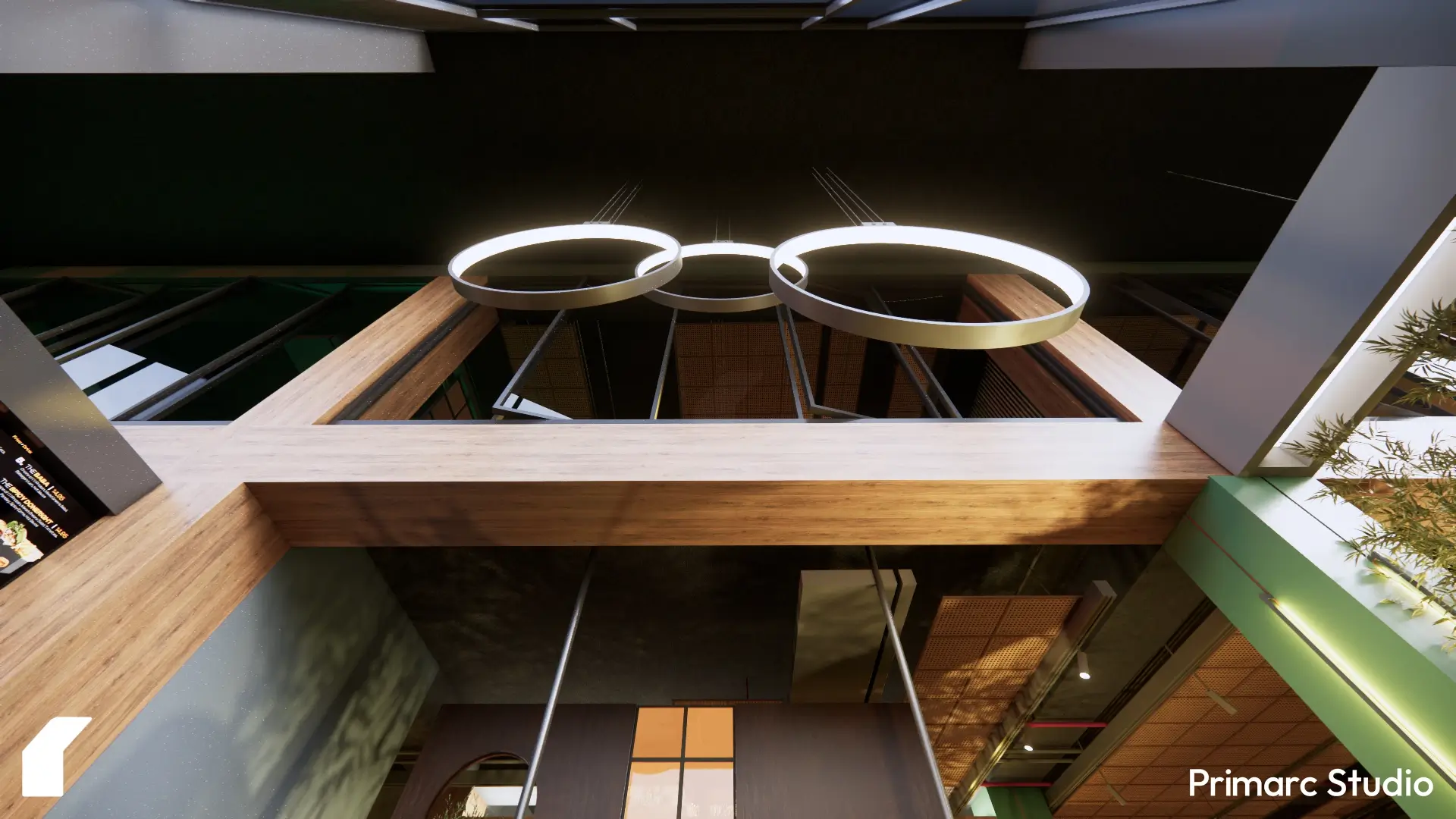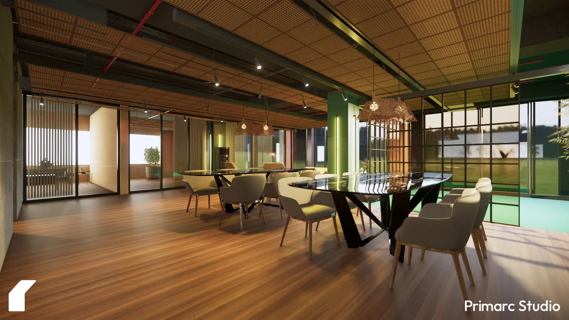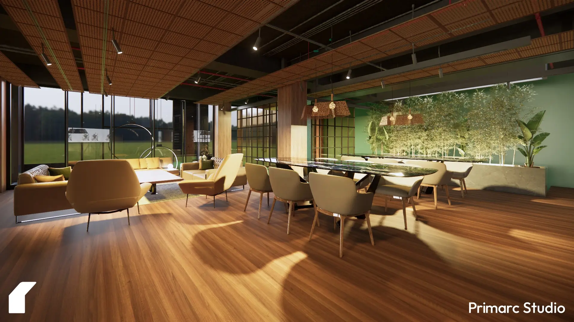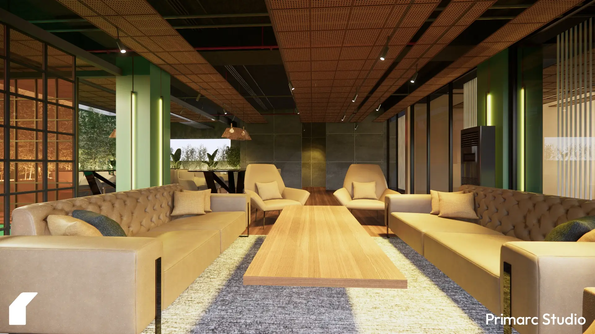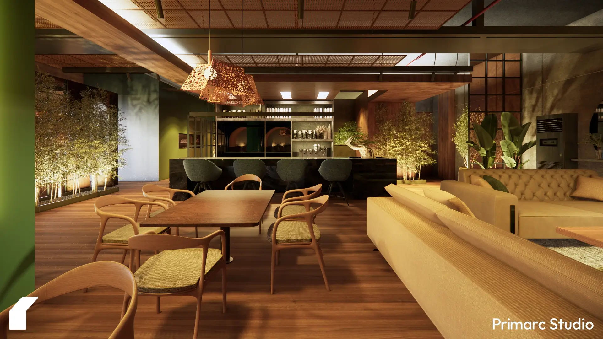 We focused on connecting the interiors to the surrounding landscape. Floor-to-ceiling windows, planters, and green walls bring in natural light and visual softness, blurring the line between indoors and out. The use of wood, woven materials, and muted greens gives the space a tactile quality, one that feels crafted rather than constructed.