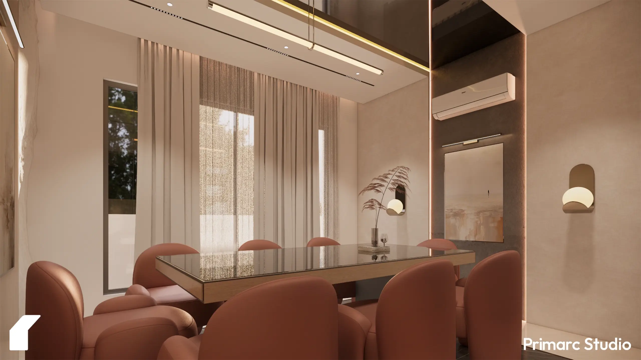 – Vertical louvers in warm tones, adding privacy, texture, and filtered daylight to the living spaces.