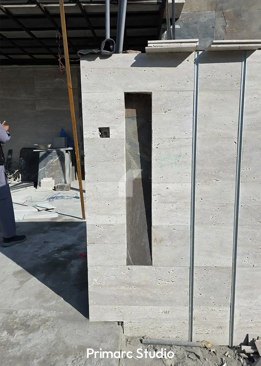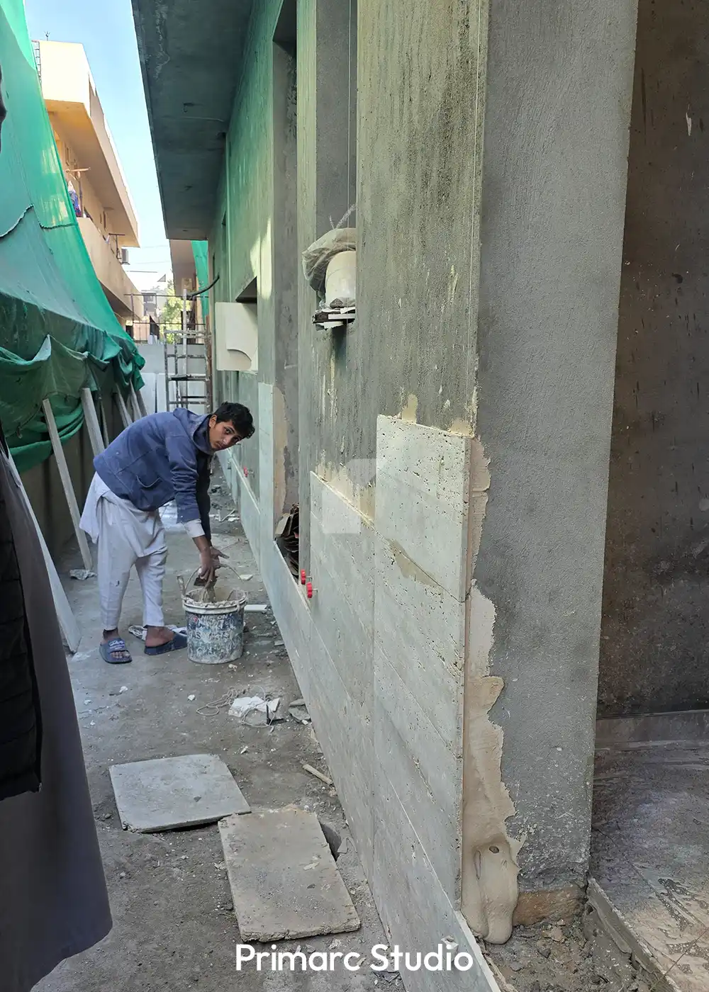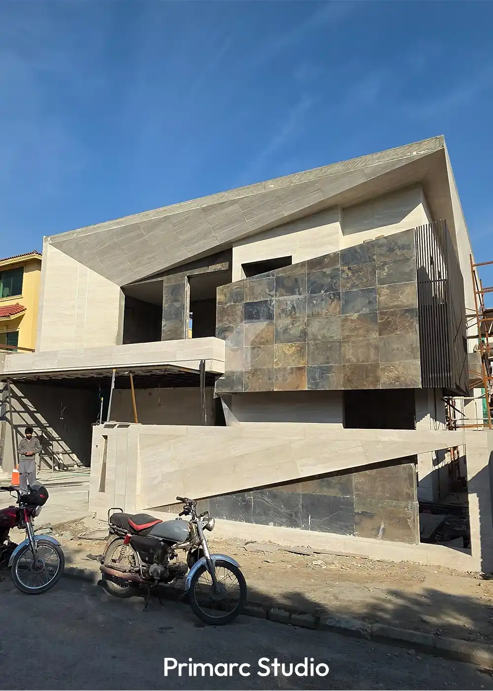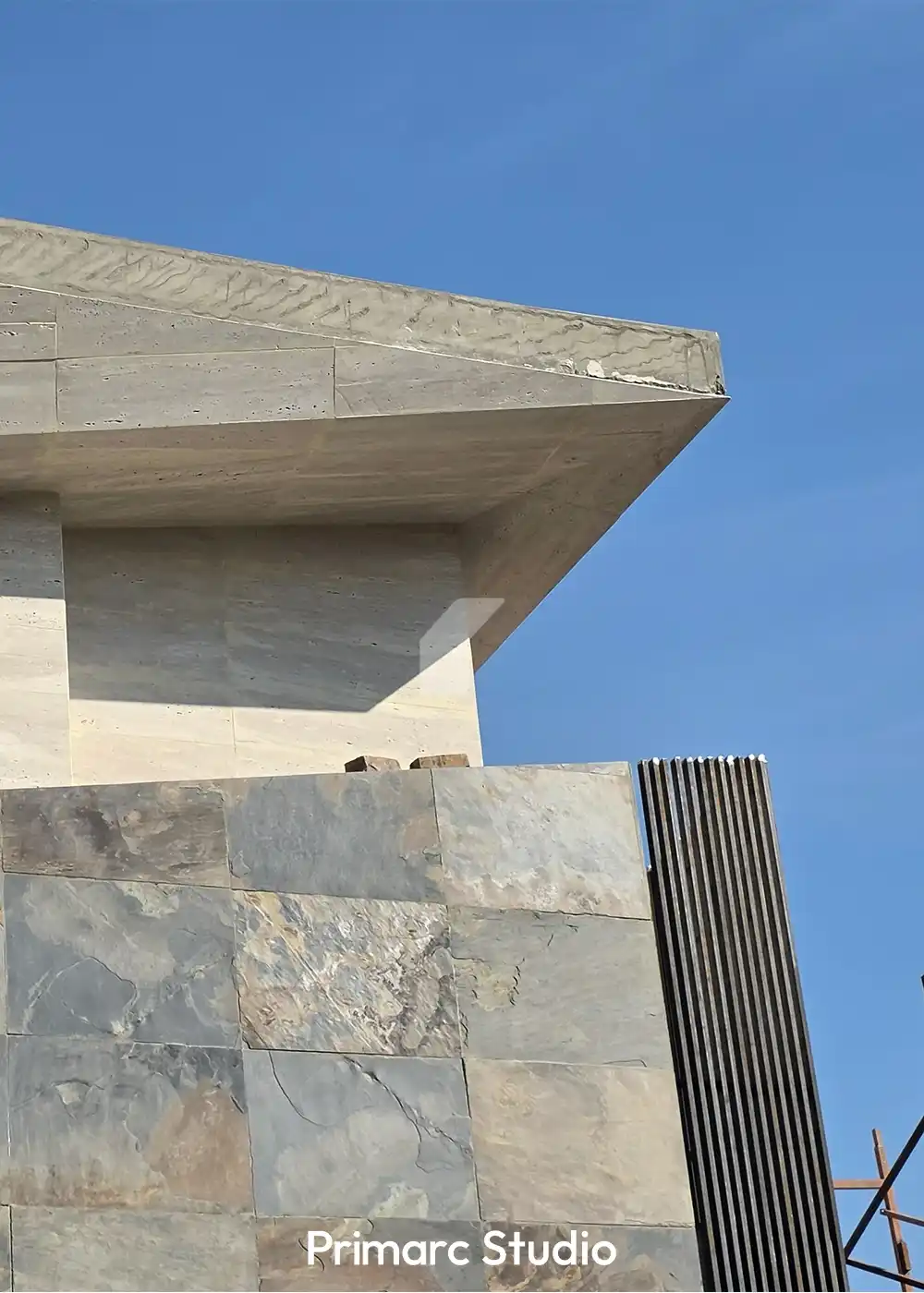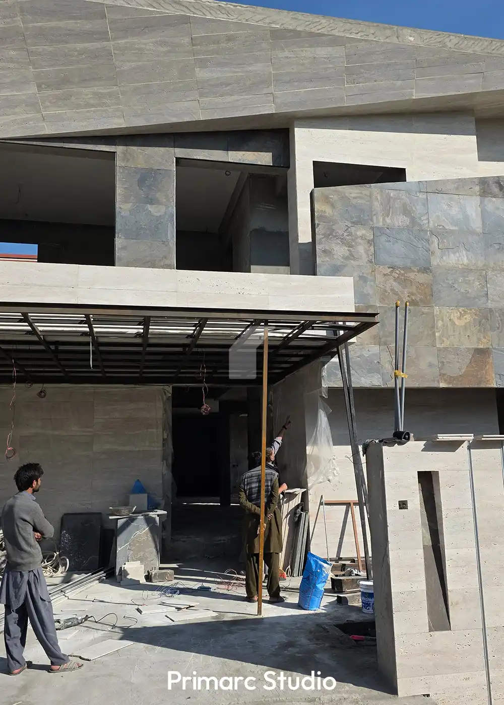 Materiality in Motion – Construction is progressing rapidly at our DHA Phase 2, Islamabad site, where the “Canopy Villa” is beginning to reveal its rich textural palette. The latest updates highlight the meticulous installation of external finishes, where we are pairing light-toned travertine with slate-textured stone cladding. This contrast not only defines the home’s geometric volumes but also ensures the structure feels grounded within its Block H surroundings.