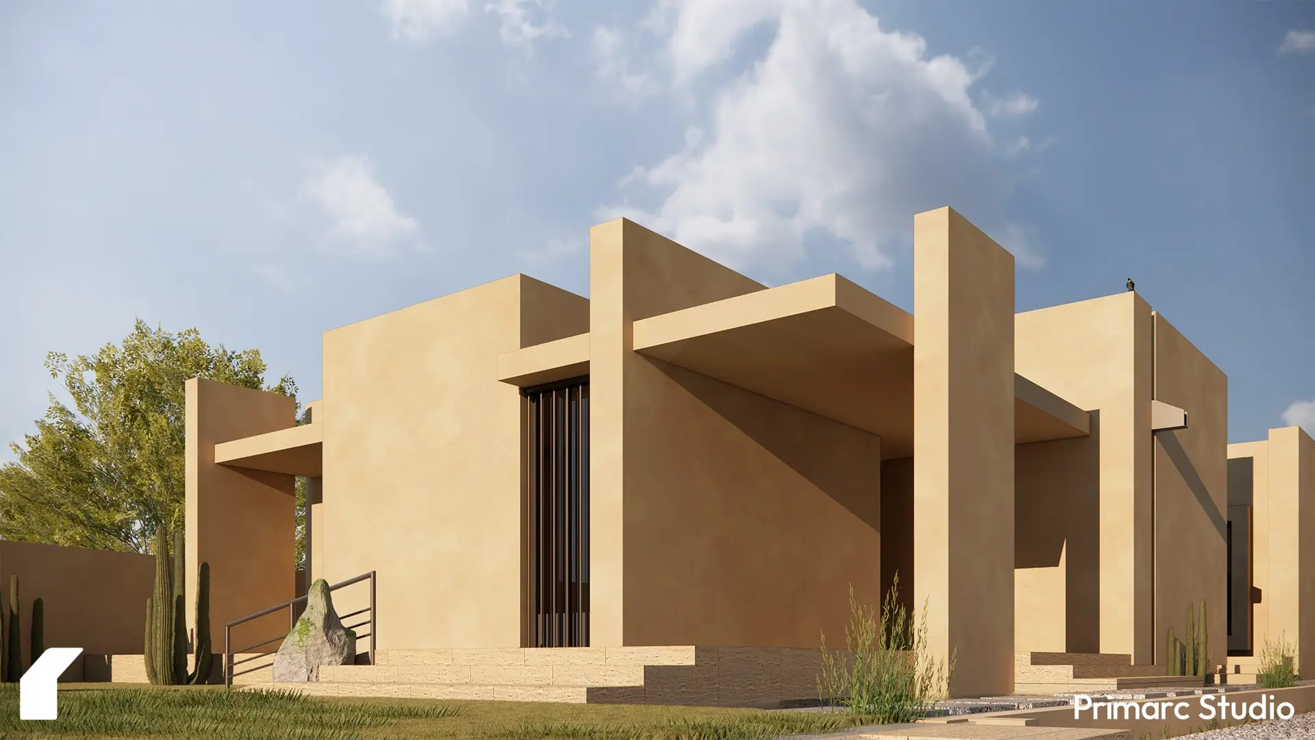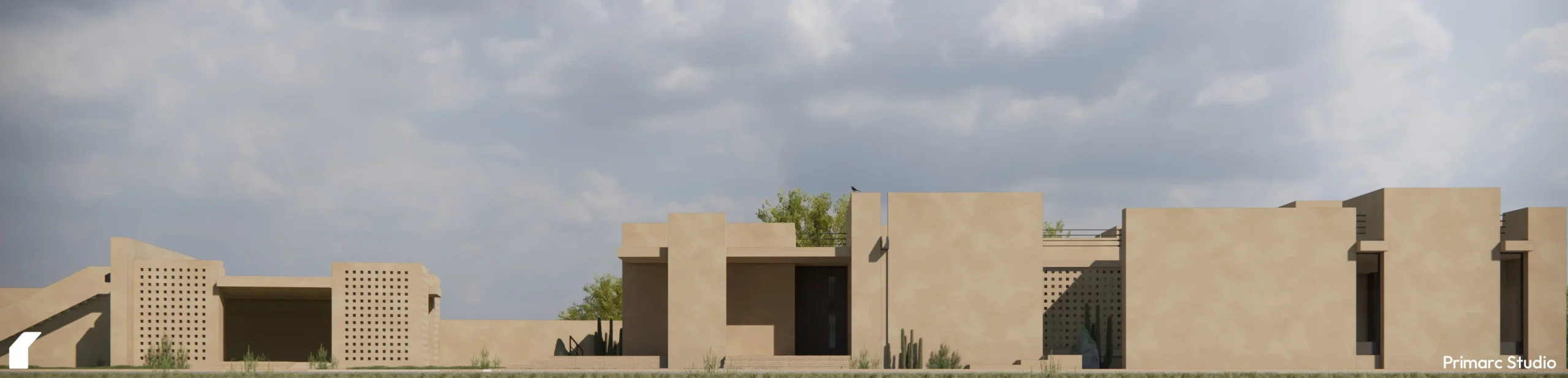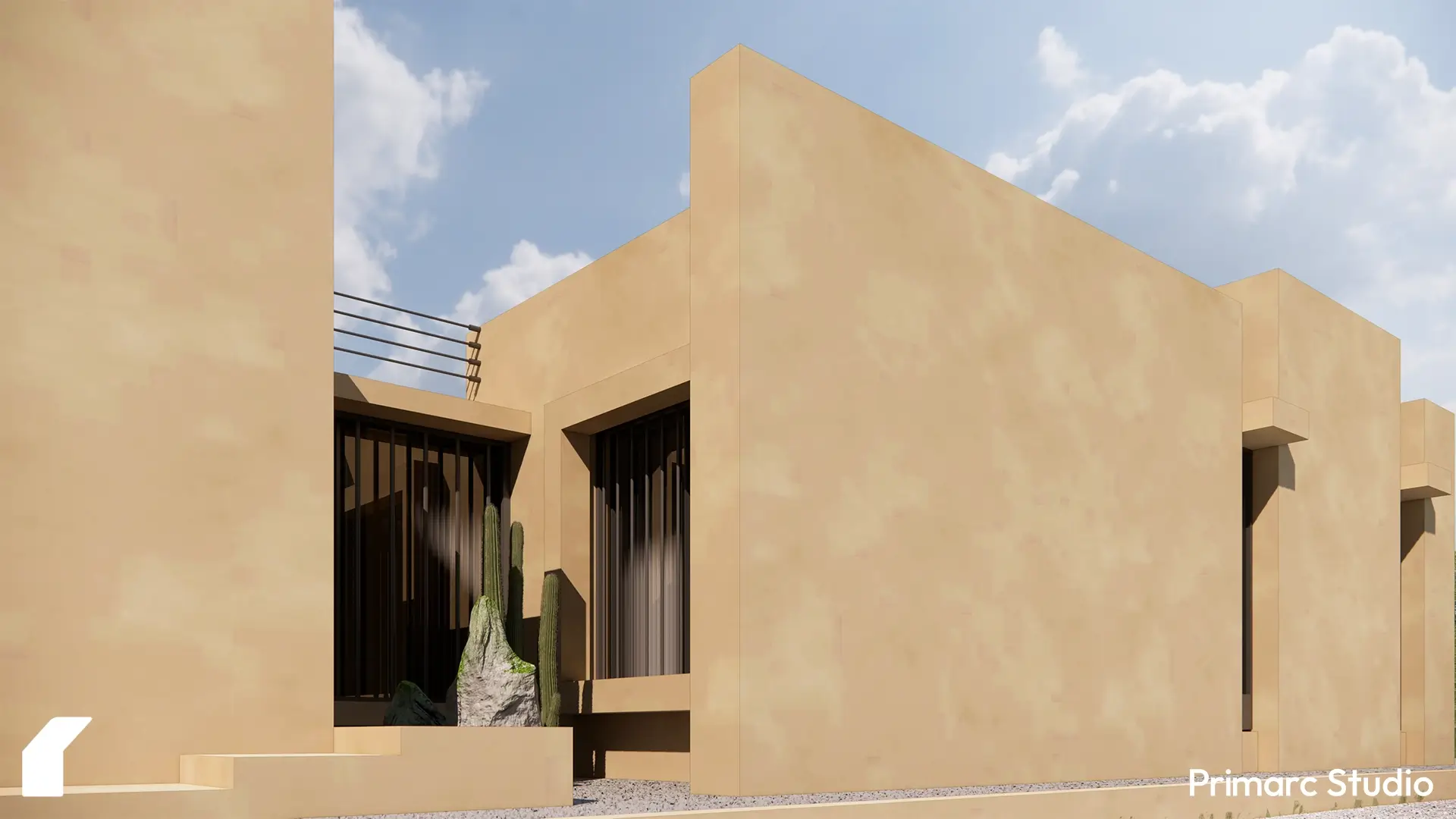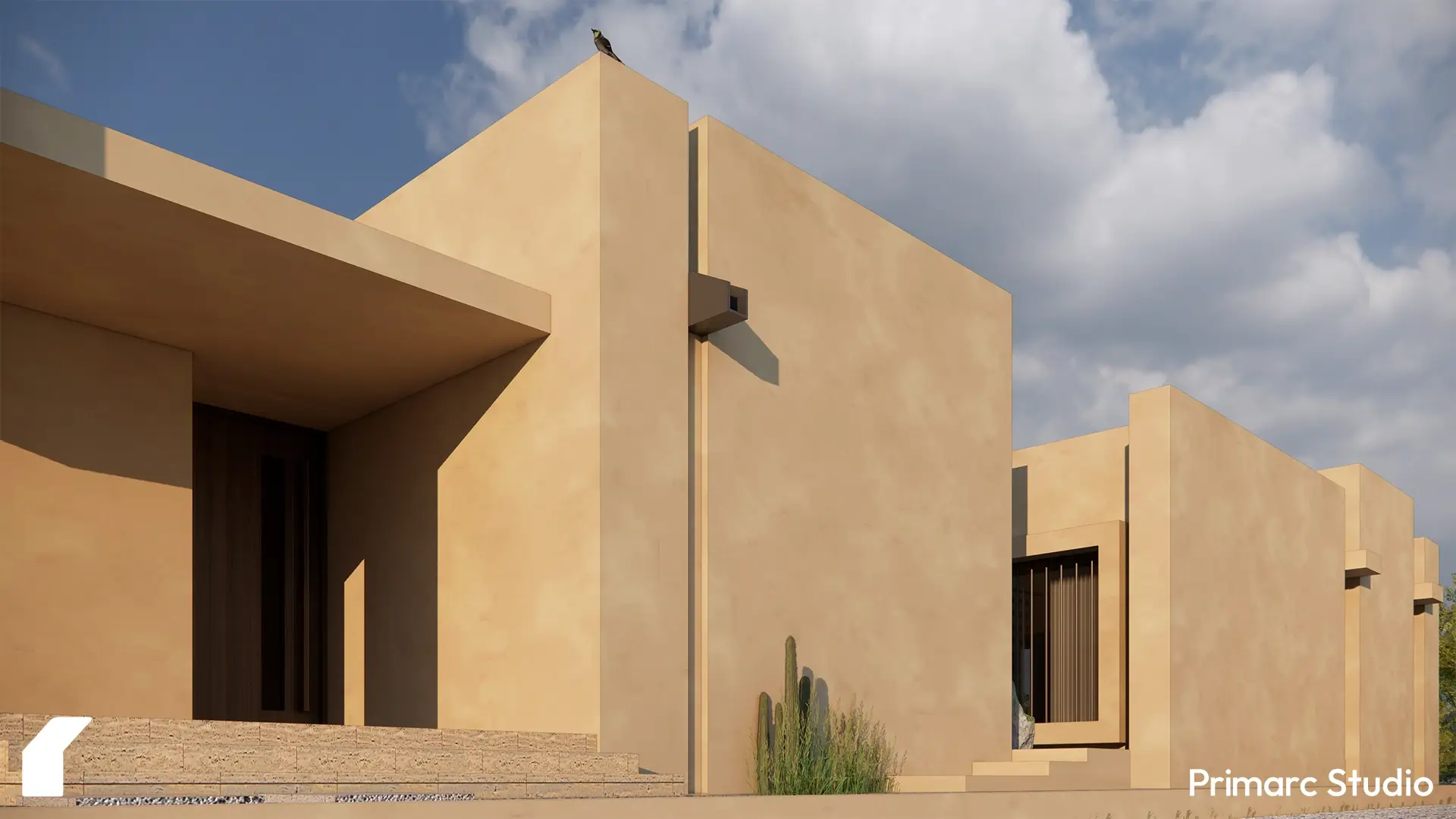 The architecture is defined by a series of intersecting rectilinear volumes. Rather than imposing a foreign aesthetic onto the site, the form is derived from a subtractive process carving out voids from a solid mass to create deep overhangs, shaded vestibules, and protected courtyards. This massing strategy not only breaks down the scale of the residence but serves a critical climatic function, generating self-shading elements that protect the glazing and interior spaces from the harsh southern sun.