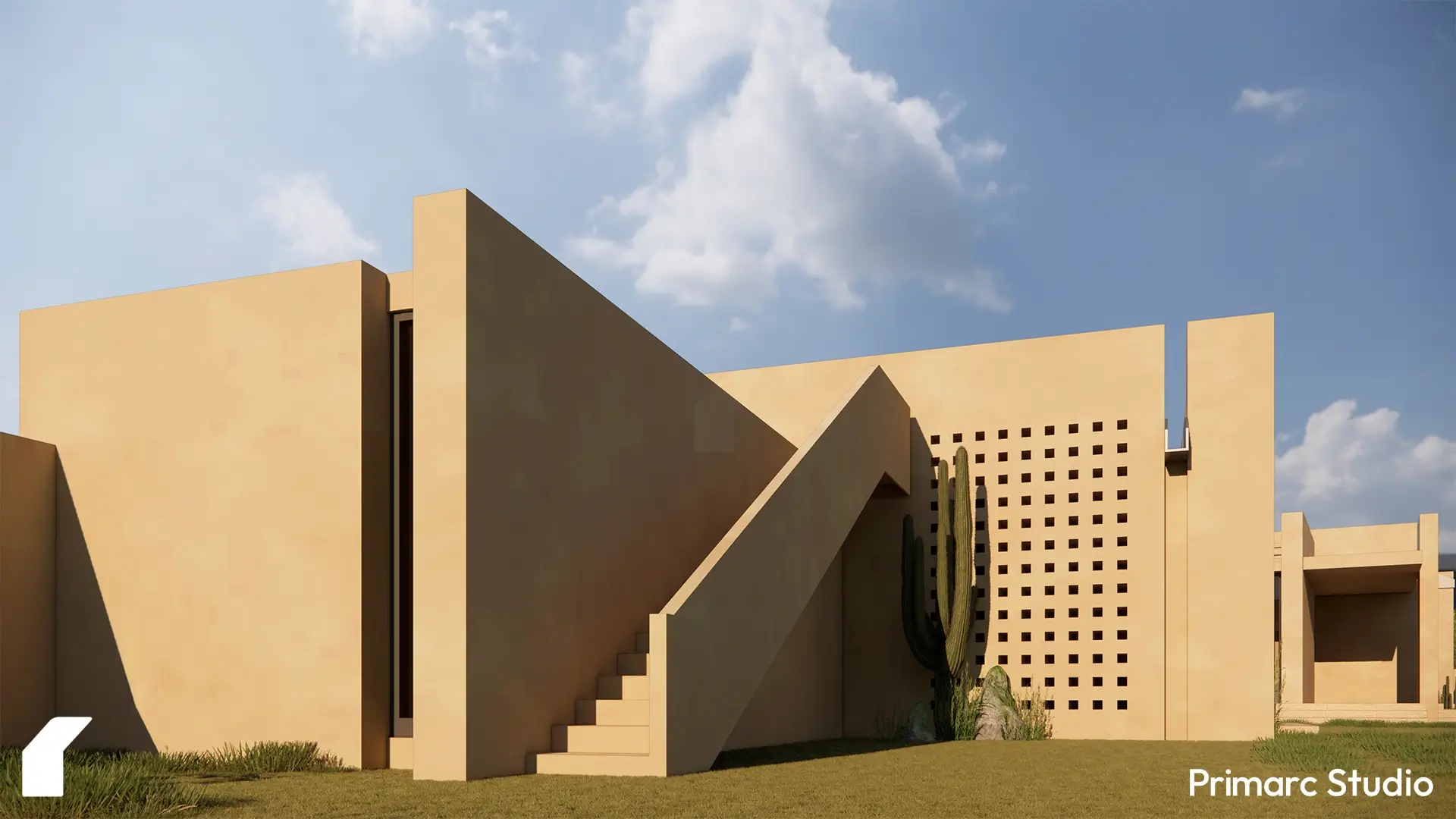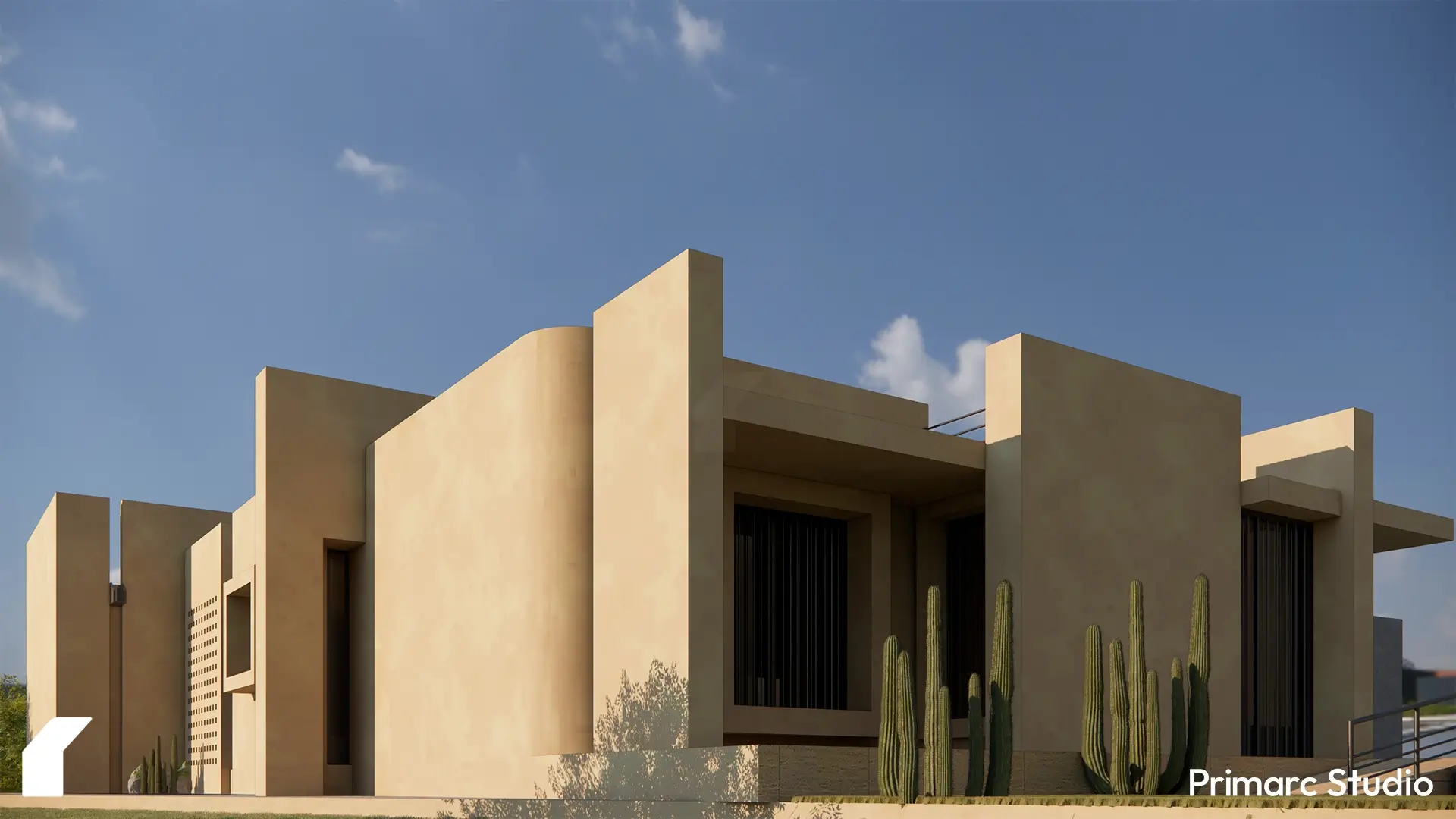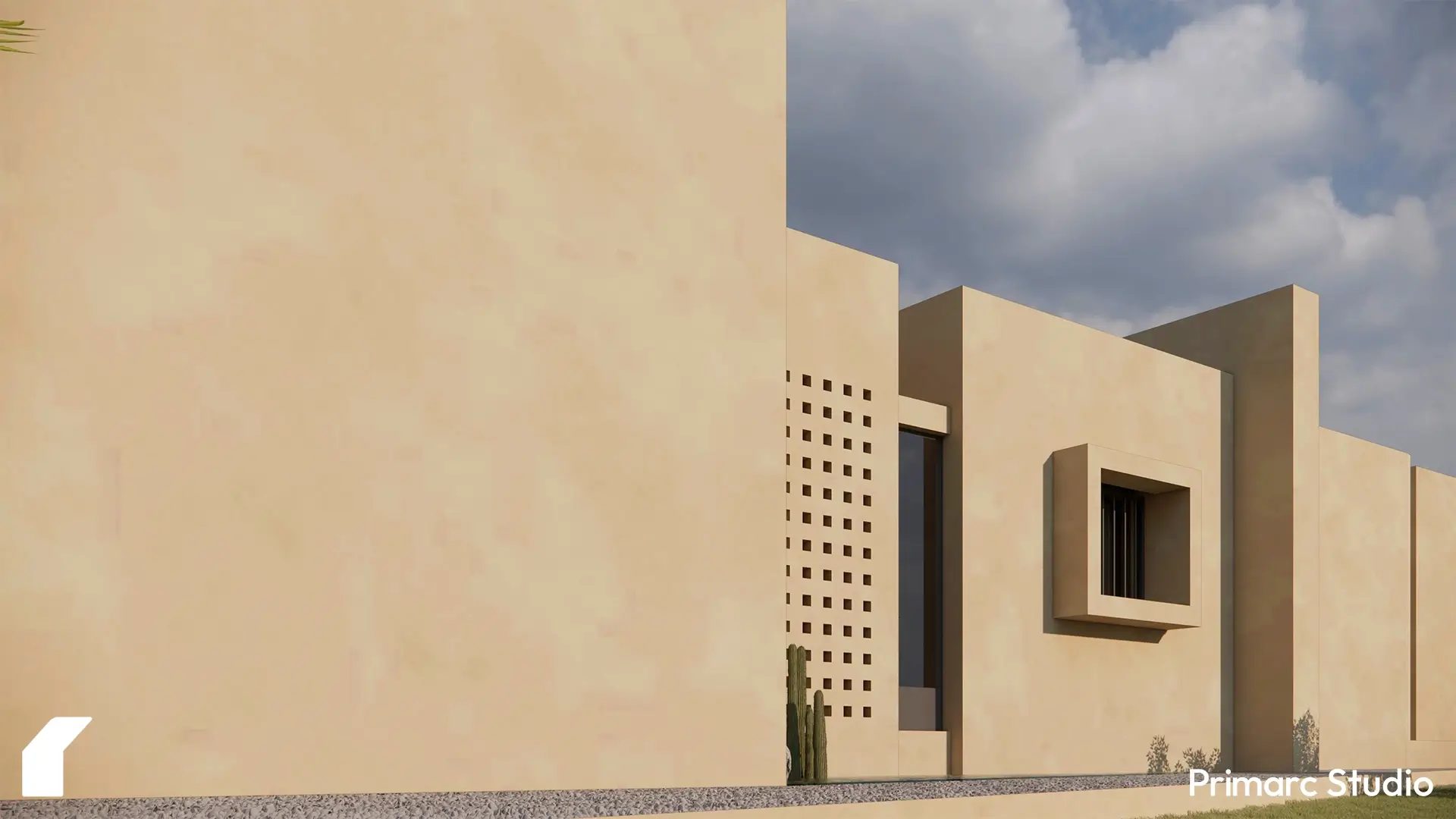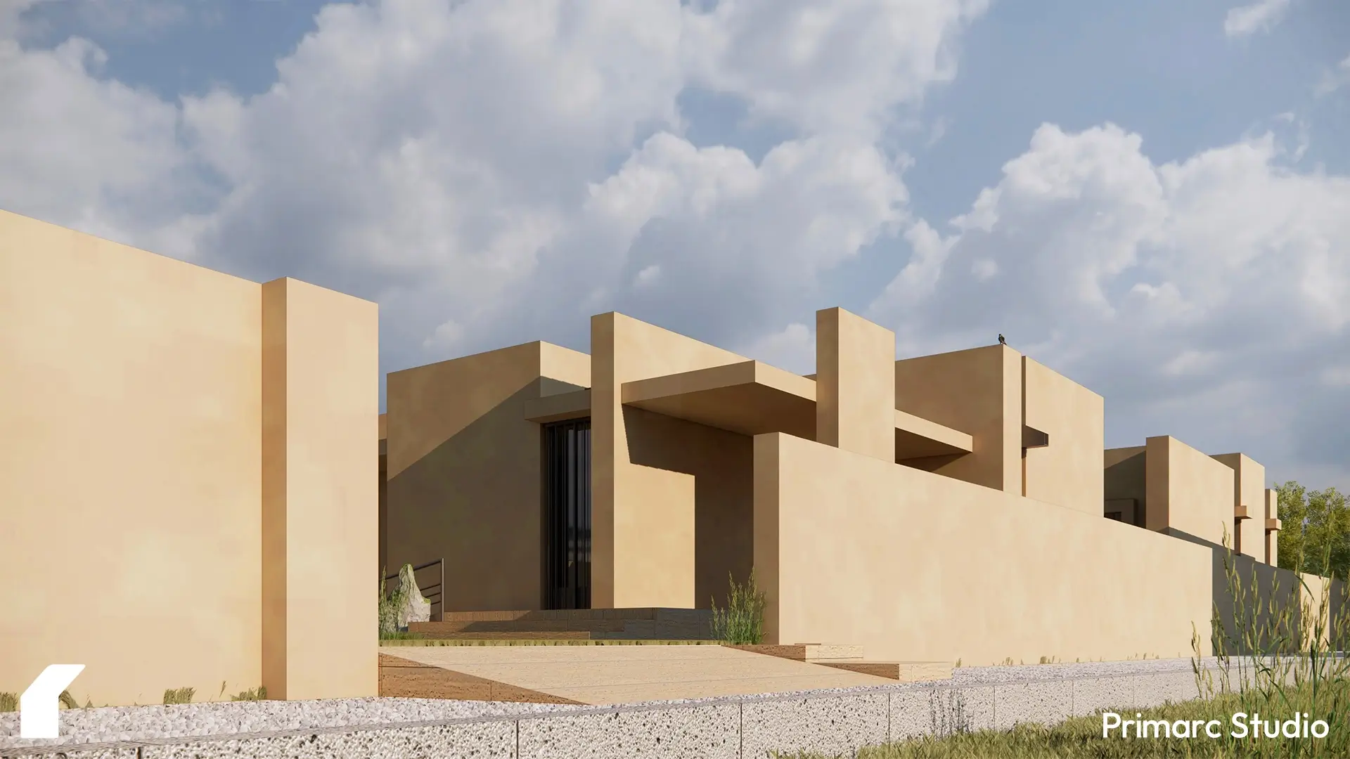 The architecture is defined by a series of intersecting rectilinear volumes. Rather than imposing a foreign aesthetic onto the site, the form is derived from a subtractive process carving out voids from a solid mass to create deep overhangs, shaded vestibules, and protected courtyards. This massing strategy not only breaks down the scale of the residence but serves a critical climatic function, generating self-shading elements that protect the glazing and interior spaces from the harsh southern sun.