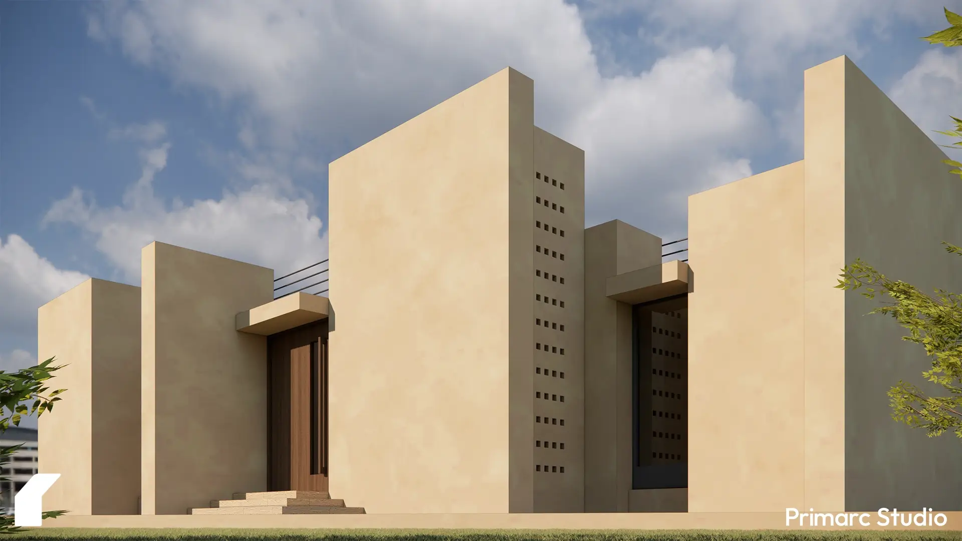 A key architectural feature is the integration of perforated screen walls (a modern reinterpretation of the vernacular jaali). These elements allow for passive ventilation and filtered daylight while maintaining privacy—a crucial requirement in the regional cultural context. The interplay between the solid, heavy walls and these porous screens creates a visual rhythm that lightens the overall massing.