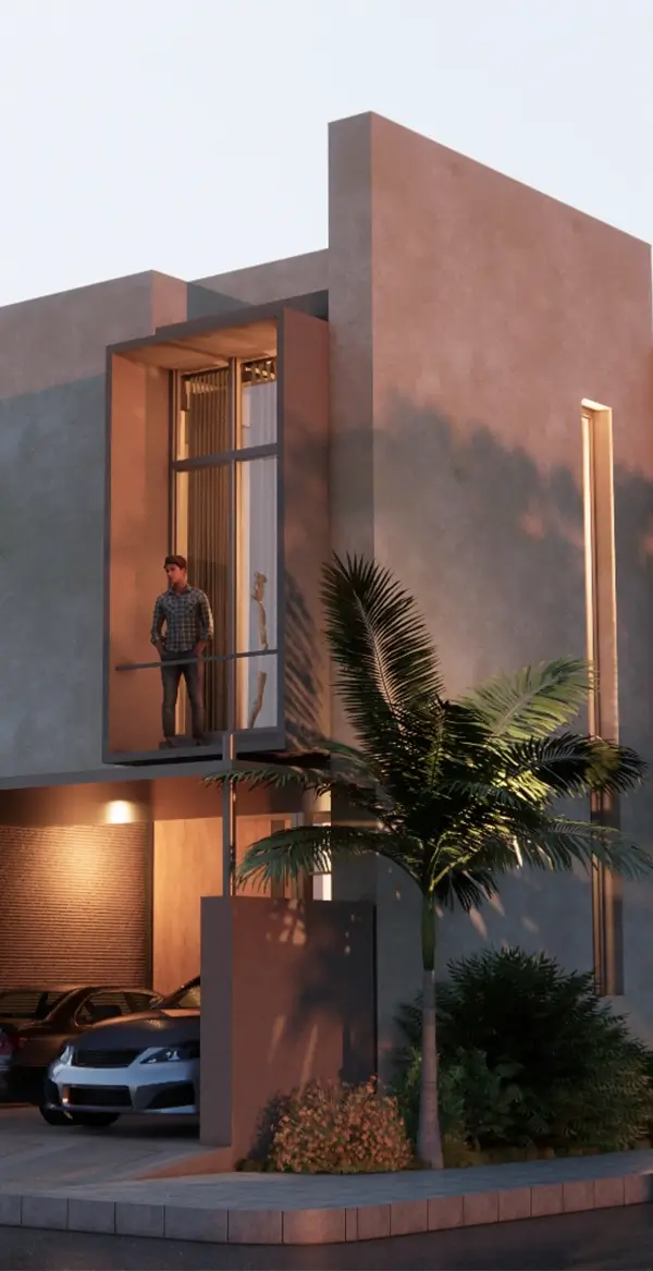 Perspective view showing the long driveway porch and brick-clad balcony of SKCON House 02.